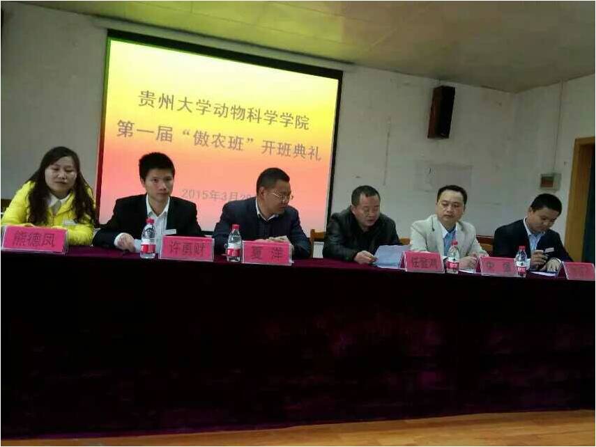 2015年3月28日上午9:00点,万象城平台第二家企业冠名班“傲农班”在南校区动科楼618教室正式签约并举行开班典礼。院党委书记任登鸿、党委副书记宋强、学生科科长钱欣荣,福建傲农生物科技集团有限公司贵州地区总经理夏洋、“傲农班”所有学员参加会议,开班仪式由钱欣荣主持。