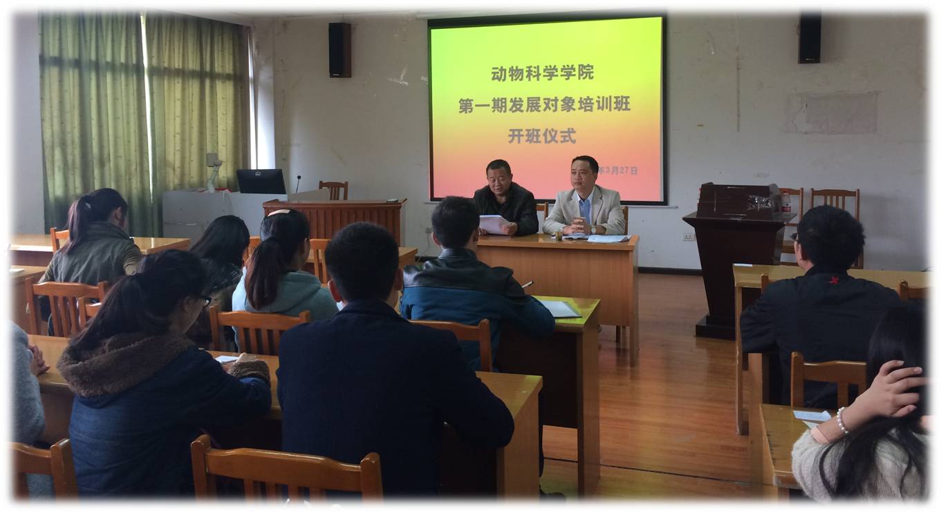 2015年3月27日下午,动物科学学院第一期党员发展对象培训班开班仪式在南区三教618教室举行,动物科学学院党委书记任登鸿、党委副书记宋强,培训班班主任及32名学员参加了开班仪式。