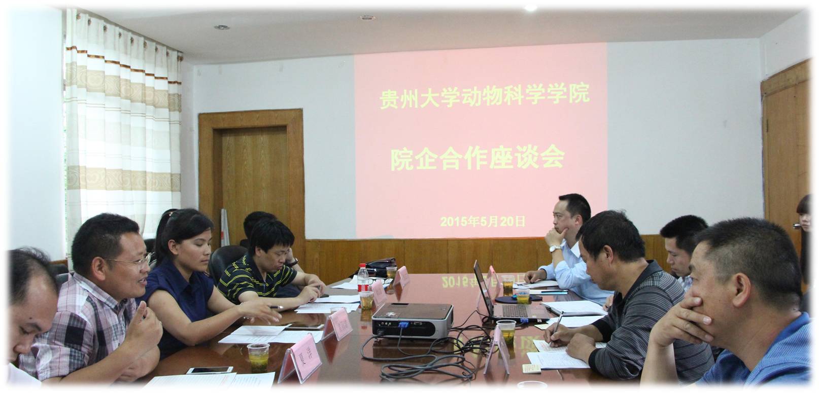 2015年5月20日,动物科学学院院企合作座谈会在我院三楼会议室召开,,动物科学学院党委书记任登鸿、院长陈祥盛、福建丰泽农牧饲料有限公司、四川特驱投资集团有限集团公司、贵州大北农农牧科技有限公司、贵州铁骑力士牧业科技有限公司、广西澳华农牧科技有限公司、傲农生物科技集团有限公司、贵州融贵生态农牧有限公司、凯里温氏畜牧有限公司等企业主要负责人参加会议,会议由动物科学学院党委副书记宋强主持。