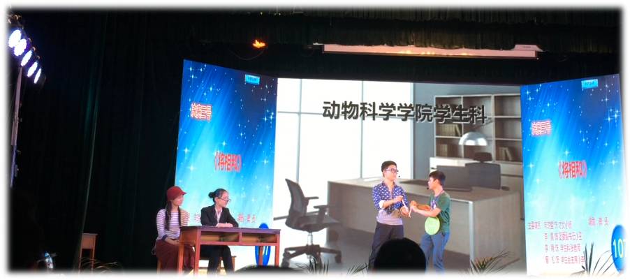 该剧本由来我院学生会主席龚贤导演,草业121班的向琼莹同学担任原创主编及角色“才女小杨”,动科131班的曾松同学扮演角色“学生会主席小李”,我院14级的李昊同学出演“团委书记小王”、李娉同学出演“学生科张老师”。主要情节为:“团委副书记小王和学生会主席小李都是工作能力很强的学生干部,但二人性格都很要强,工作中总会产生矛盾,严重影响了工作的开展。在接到举办心理健康活动月的通知后,二人通过一出将相和,最终圆满完成了老师交代的任务。”