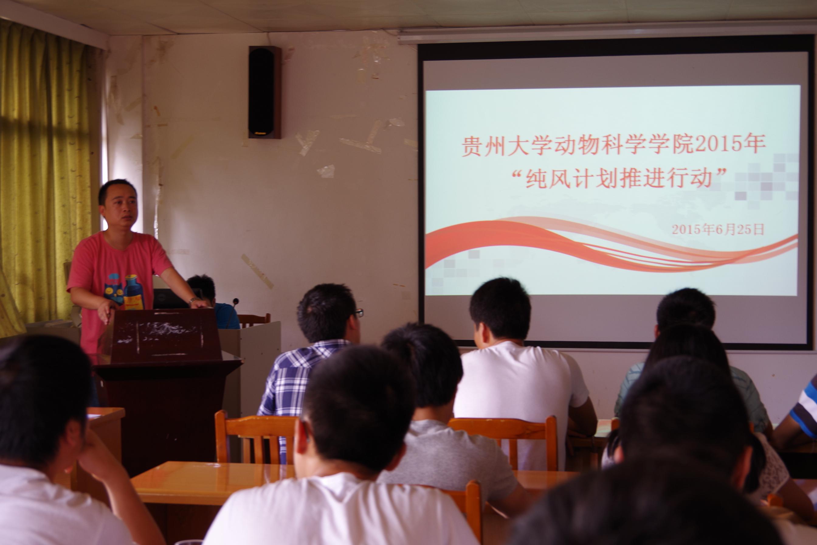 为落实贵州大学“纯风计划推进行动”,进一步严肃学院考风考纪,推进学院学风建设,动物科学学院6月25日在南校区3教开展诚信考试签名活动。学院党委副书记宋强参加会议并讲话,肯定了学院学风建设取得的成绩,同时也指出了存在的问题。强调要以“纯风计划”为契机,采取各种措施营造良好学风。期末考试在即,宋强副书记要求全院学生严格遵守考试纪律,严肃考风考纪,诚信考试,杜绝作弊,实现考试零作弊。 全院60余名学生代表参加了签名活动,学生科科长钱欣荣主持签名活动。 党委副书记宋强作动员讲话 学生代表签名 最后,全体干部成员在墙面的“诚信考试签名”白板上写下自己的名字,许下:诚信考试、诚信过级、诚信毕业的誓言。活动的顺利开展,不但使学生正确认识了考试和考试作弊的严重后果,而且从素质教育的角度看待考试作弊,做好考试的准备,树立一个良好的考风考纪。从我做起,从现在,从考风做起。 (动科院团委学生会新通部:朱晓锋编辑/摄影)