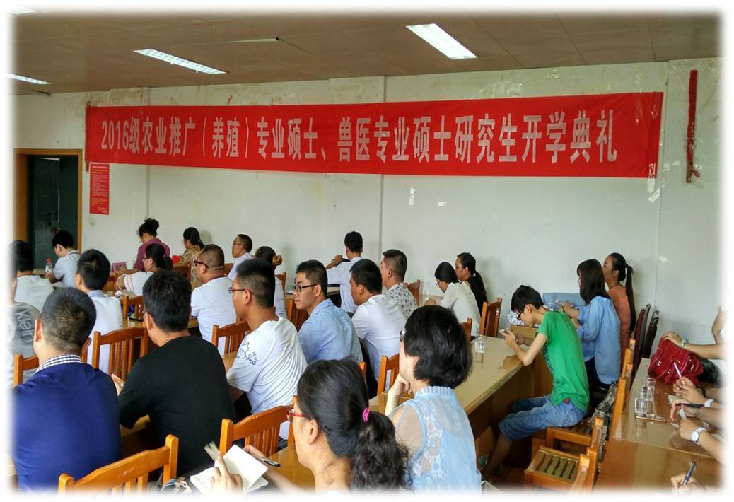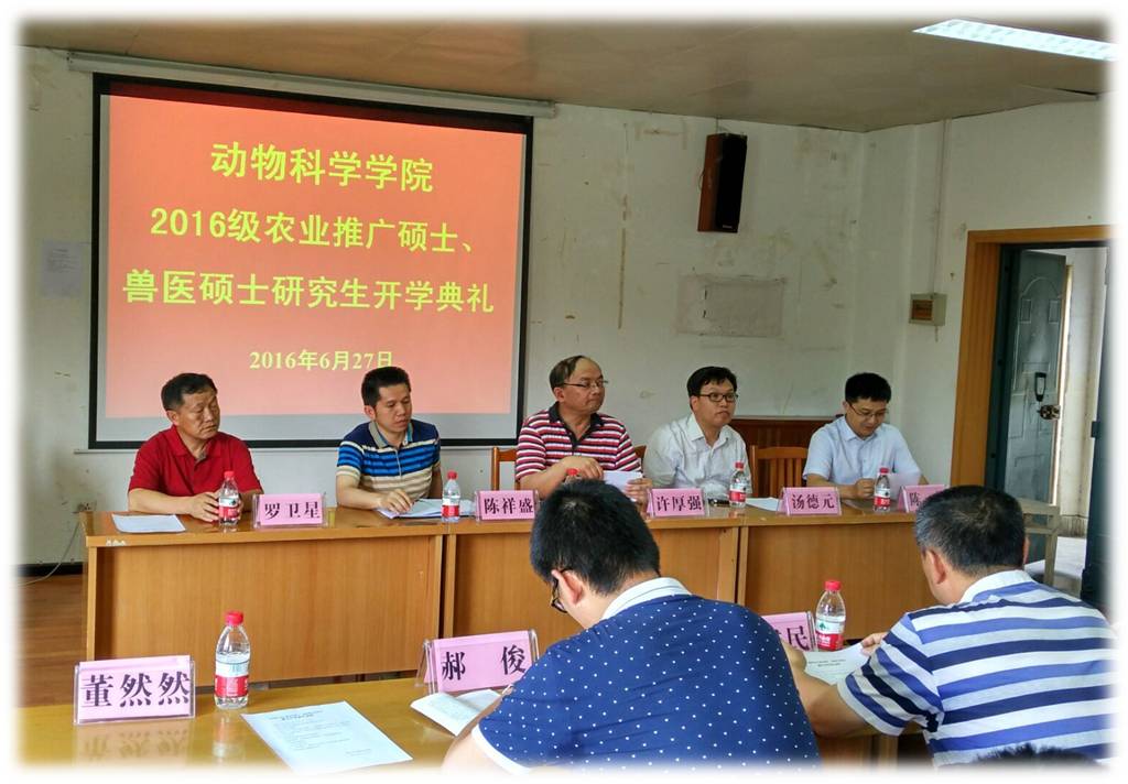 2016年6月27日下午,动物科学学院举行2016年农业推广专业硕士及兽医专业硕士开学毕业典礼。出席会议的有动物科学学院院长陈祥盛教授、贵州大学校长助理、科学技术研究院常务副院长许厚强教授、副院长罗卫星教授、副院长陈超副教授、校科技园副主任汤德元教授等出席了开学典礼。 首先陈祥盛院长代表学院致辞,对新同学表示由衷的祝贺和热烈的欢迎,并嘱托同学们有效利用学校资源,合理安排好学习生活,殷切地希望同学们通过努力,学有所成,学有所用。 随后,许厚强教授在典礼上发言,他对新生寄予美好的祝愿。教师代表文明老师表示,严格按照教学大纲的要求,扎扎实实地培养学生专业理论知识和实际操作能力。2016级新生代表进行了发言,表达了对美好的研究生生活和学习的憧憬,承诺会努力完成学业,不辜负学校和老师们的期望。 之后,陈超副院长对新生报到、注册及选课等工作进行了专门指导。最后,在一片欢声笑语中,全体师生进行拍照合影留念。