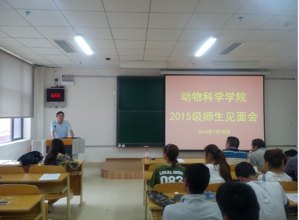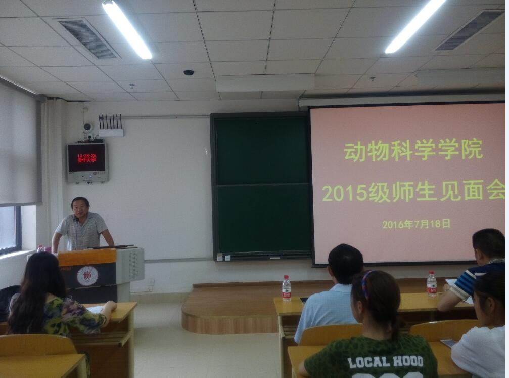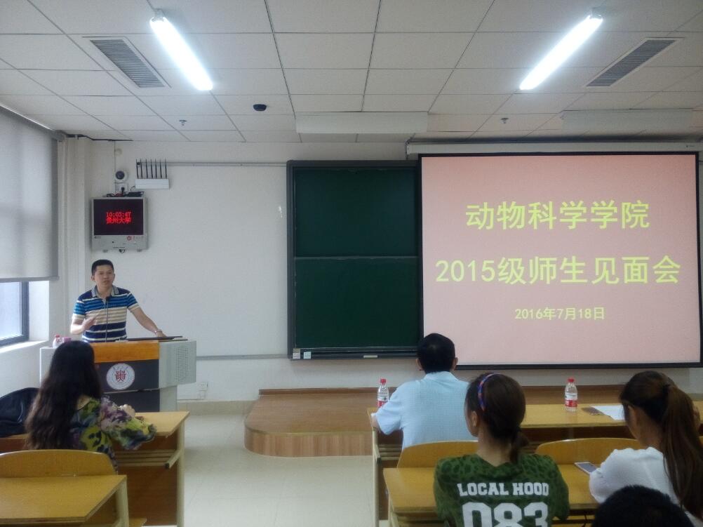 2016年7月19日上午,动物科学学院2015级师生见面会在贵州大学西校区北楼召开。院党委书记任登鸿、院长陈祥盛出席会议,院党政办公室副主任熊建民、教学科研科科长肖超能、学生科辅导员吴萌尧及2015级全体本科生参加会议。2015级师生见面会由院学生科科长钱欣荣老师主持。