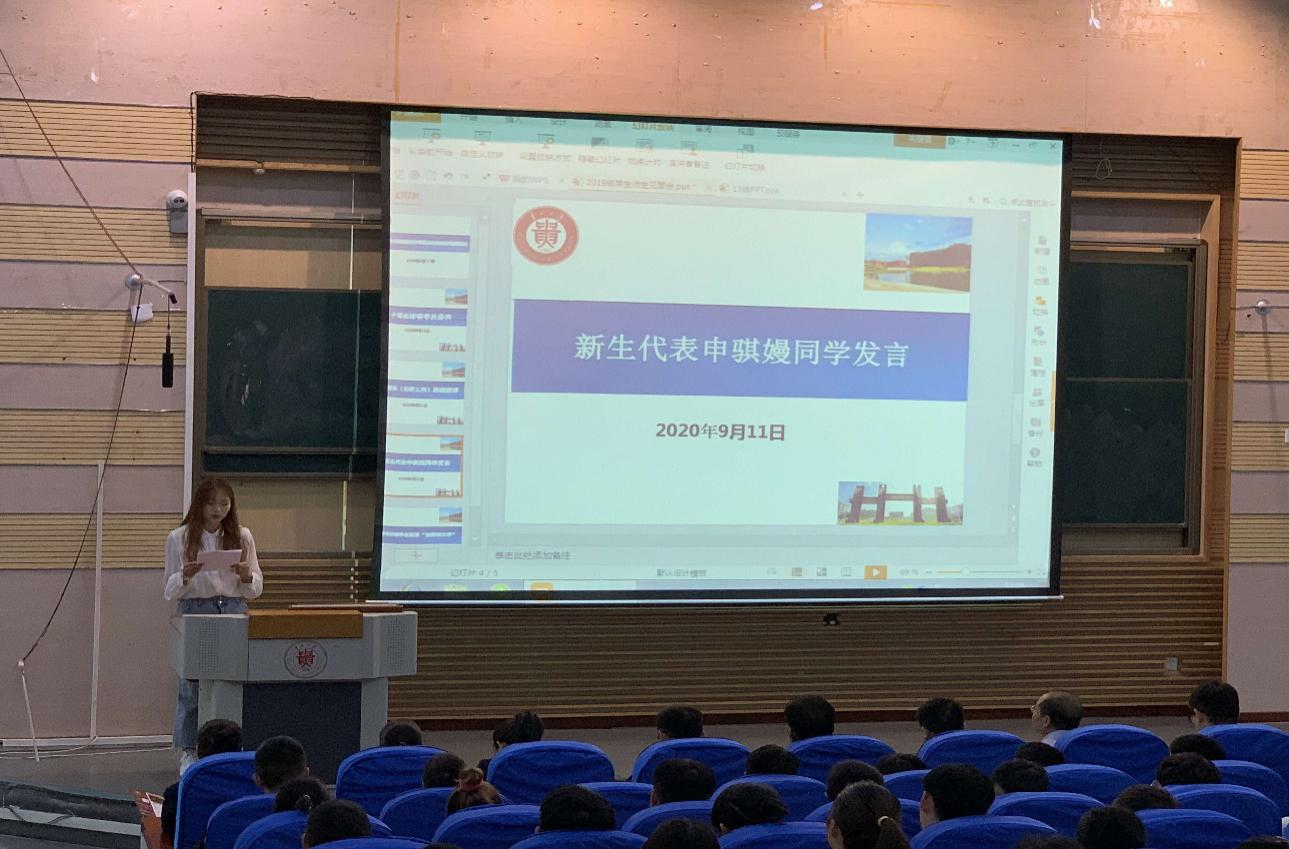 动医192班申骐嫚同学代表全体2019级同学作新生发言,从三个方面向全体同学发出号召:立鸿鹄志,做祖国可靠的接班人;锤炼品格,做明德至善的贵大人;练强本领,做功底深厚的动科人。