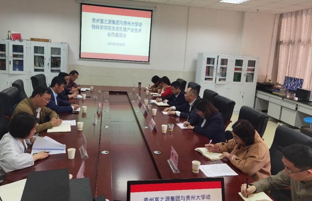座谈会中,陈祥首先对贵州富之源集团一行的到来表示诚挚欢迎,并介绍了我院的师资力量、学科特色及科研平台建设情况等院情。富之源集团总经理梁晓文从富之源公司概况、生猪产业发展历程和现状、未来规划三个方面进行了详细介绍。李忠超博士也详细介绍了富之源集团的技术研发中心组织架构及岗位职责。随后双方围绕猪的育种、饲料营养调控、疫病防控、技术研发创新、校企实训基地建设等方面进行深入研讨。