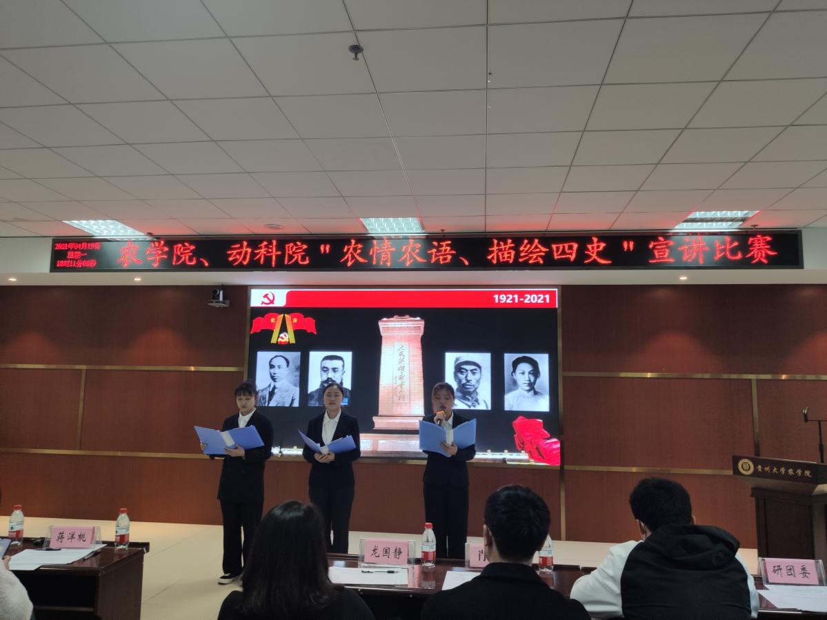 为了深入学习贯彻习近平总书记在党史学习教育动员大会上的重要讲话精神,落实学校党史学习教育及“牢记殷切嘱托、忠诚干净担当、喜迎建党百年”专题教育的有关要求,推动农科学子知史爱党,明史爱国,践行初心和使命,传承红色基因,4月19日晚,动物科学学院及农学院研究生团总支在崇学楼339报告厅共同举办了“农情农语、描绘四史”宣讲比赛,农学院党委副书记王巩,动物科学学院研究生科科长龙国静,辅导员李超、蒋洋桃,学生科负责人黄其河,农学院研究生科肖宇出席宣讲比赛并担任评委。