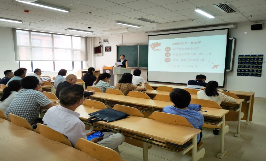 为保证2021届毕业生安全离校、文明离校,根据校、院党委的有关要求,2021年6月15日下午,动物医学系组织全系教职工及毕业生,就师生生命及财产安全、实验室安全、切实推进本科生及研究生就业工作进行安排部署。