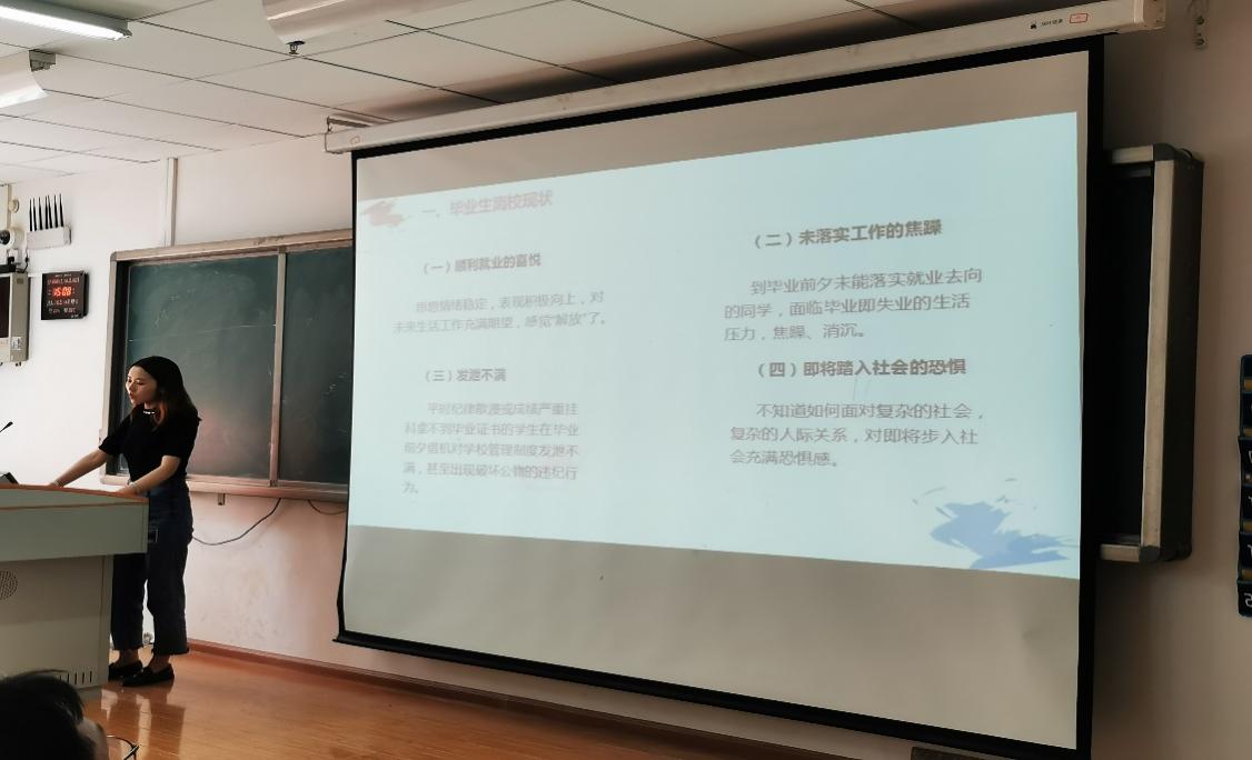 会议最后,学生辅导员、动医系毕业班班主任聂江昱菡对全体毕业生离校心理现状及要求进行分析和安排,在与毕业生沟通交流的过程中,就其关注的问题进行解答和分析,强调学生安全文明离校。