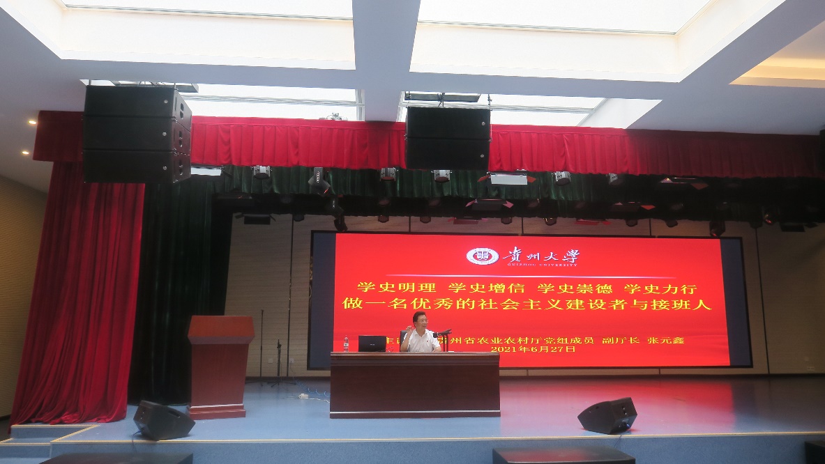 6月17日下午,在崇实楼110报告厅,贵州大学优秀校友、省农业农村厅党组成员、副厅长张元鑫和省农业农村厅总兽医师唐隆强莅临动物科学学院讲授党史学习教育专题党课,激励全院教职工生从党史学习中汲取力量,做到学党史、悟思想、办实事、开新局。学院党政领导、全院教职工、学生党员及入党积极分子300余人到场聆听。