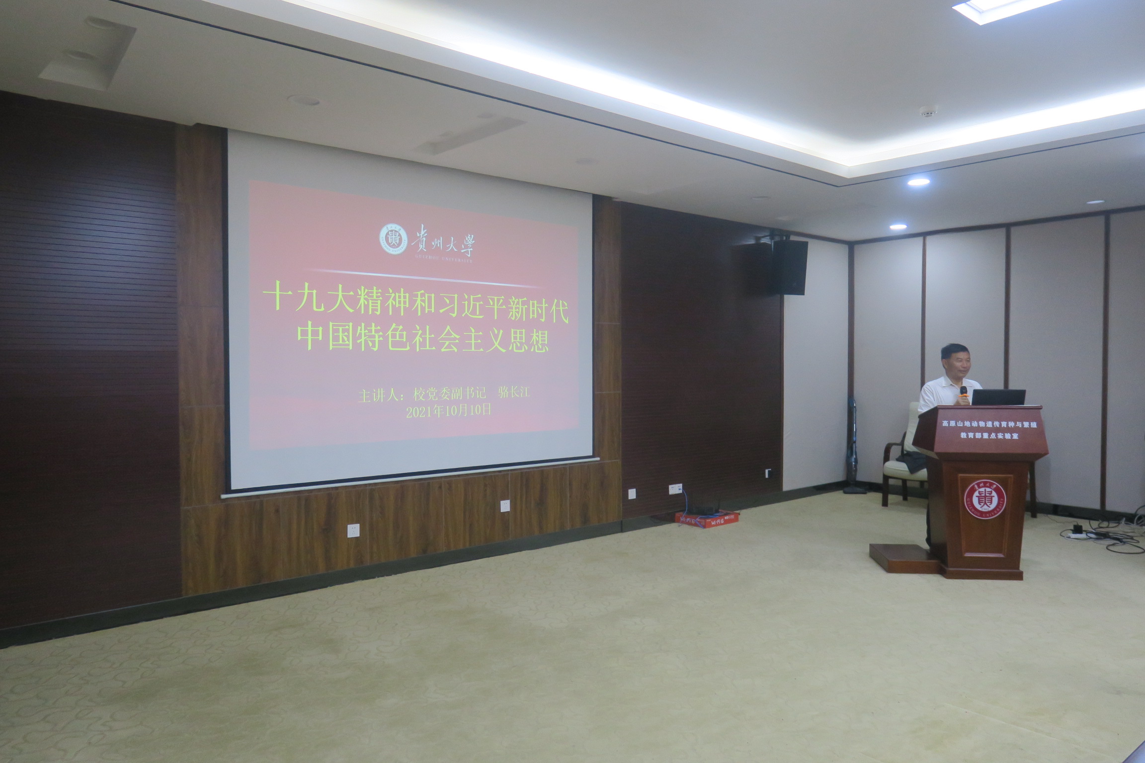 2021年10月10日下午2:30,校党委副书记骆长江在崇学楼324为动物科学学院第三十五期入党积极分子培训班学员授课。授课内容为《党的十九大精神和习近平新时代中国特色社会主义思想》,党课由动物科学学院党委书记罗聃宁主持,入党积极分子50余人参加培训。