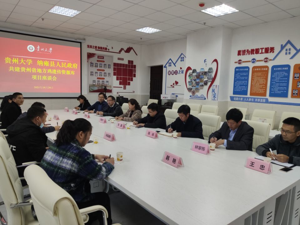 10月28日下午,我院组织召开了《贵州省地方鸡遗传资源库建设项目》座谈会,学院党委书记罗聃宁、院长陈超、副院长陈祥、副院长欧德渊、我校生态家禽团队核心成员,以及纳雍县农业农村局畜牧中心主任蔡康俊等一行5人参加了会议。