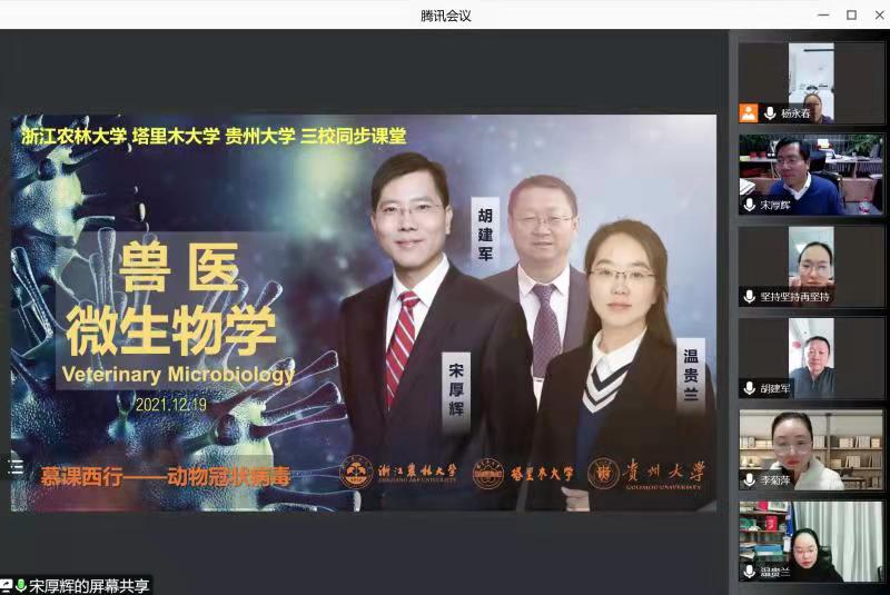 12月5日,我院《兽医微生物学》虚拟教研室“慕课西行•三校同步”课堂教学筹备研讨会在线上腾讯会议室举行。浙江农林大学宋厚辉教授和塔里木大学胡建军教授及其团队成员、智慧树平台及区域负责人、我院《兽医微生物学》课程团队负责人温贵兰教授以及部分教师和学生代表参会。会议由浙江农林大学党委委员、教育部动物医学类专业教学指导委员会委员宋厚辉教授主持。