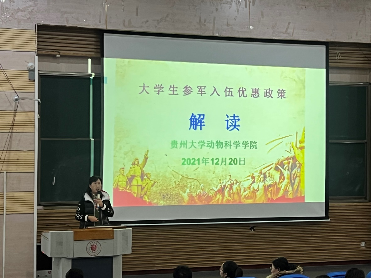 随后罗聃宁进行了征兵宣传。她介绍了大学生参军入伍的优抚优待政策,尤其重点介绍了贵州大学关于进一步推进征兵工作的行动计划、贵阳市出台的“前置招聘”政策,她鼓励男同学们积极响应号召,携笔从戎,把“成才梦”融入到“强国梦”和“强军梦”之中,将个人理想与国家民族的前途和命运结合起来,自觉扛起时代所赋予的责任,以实际行动报效祖国。