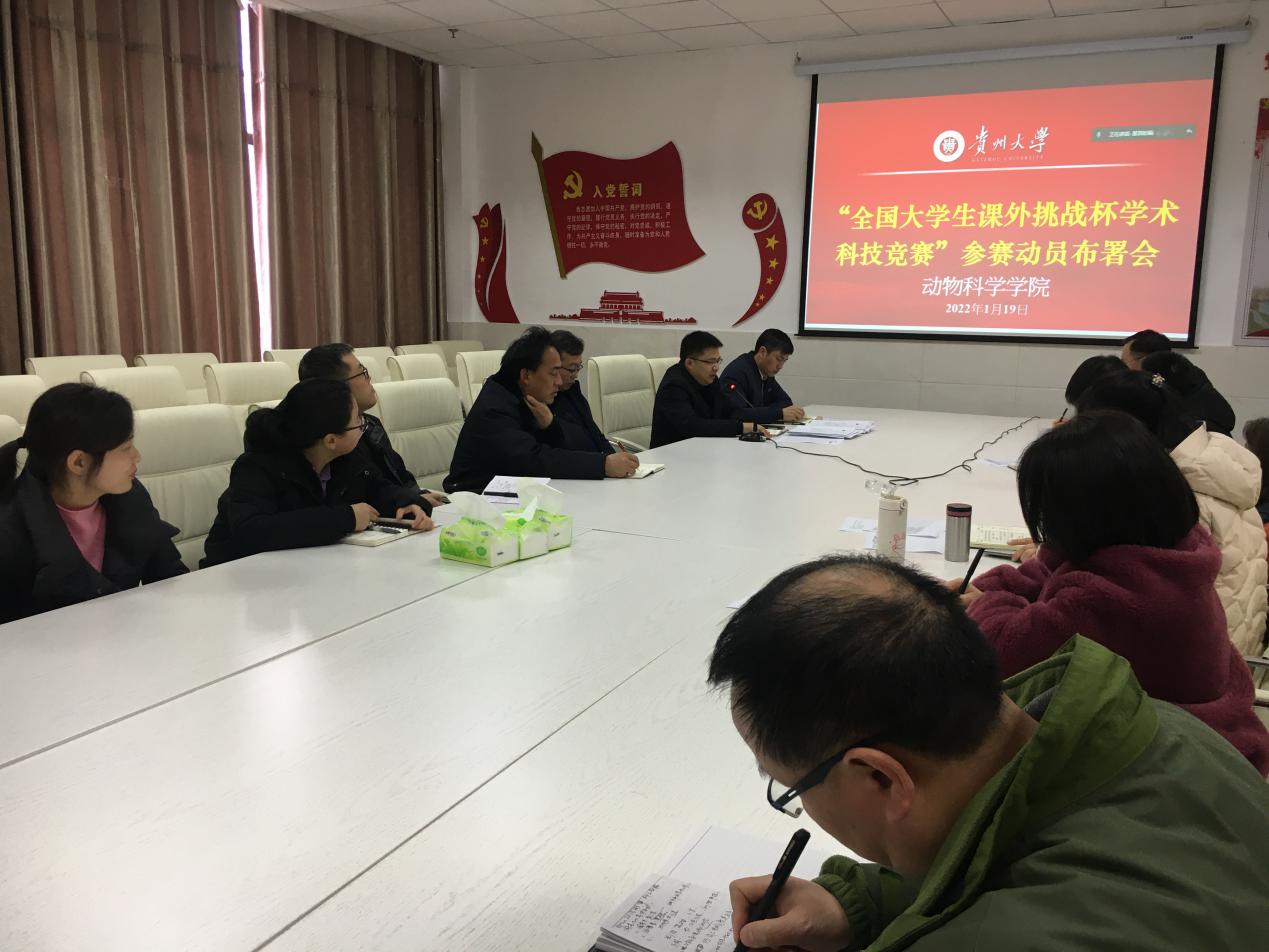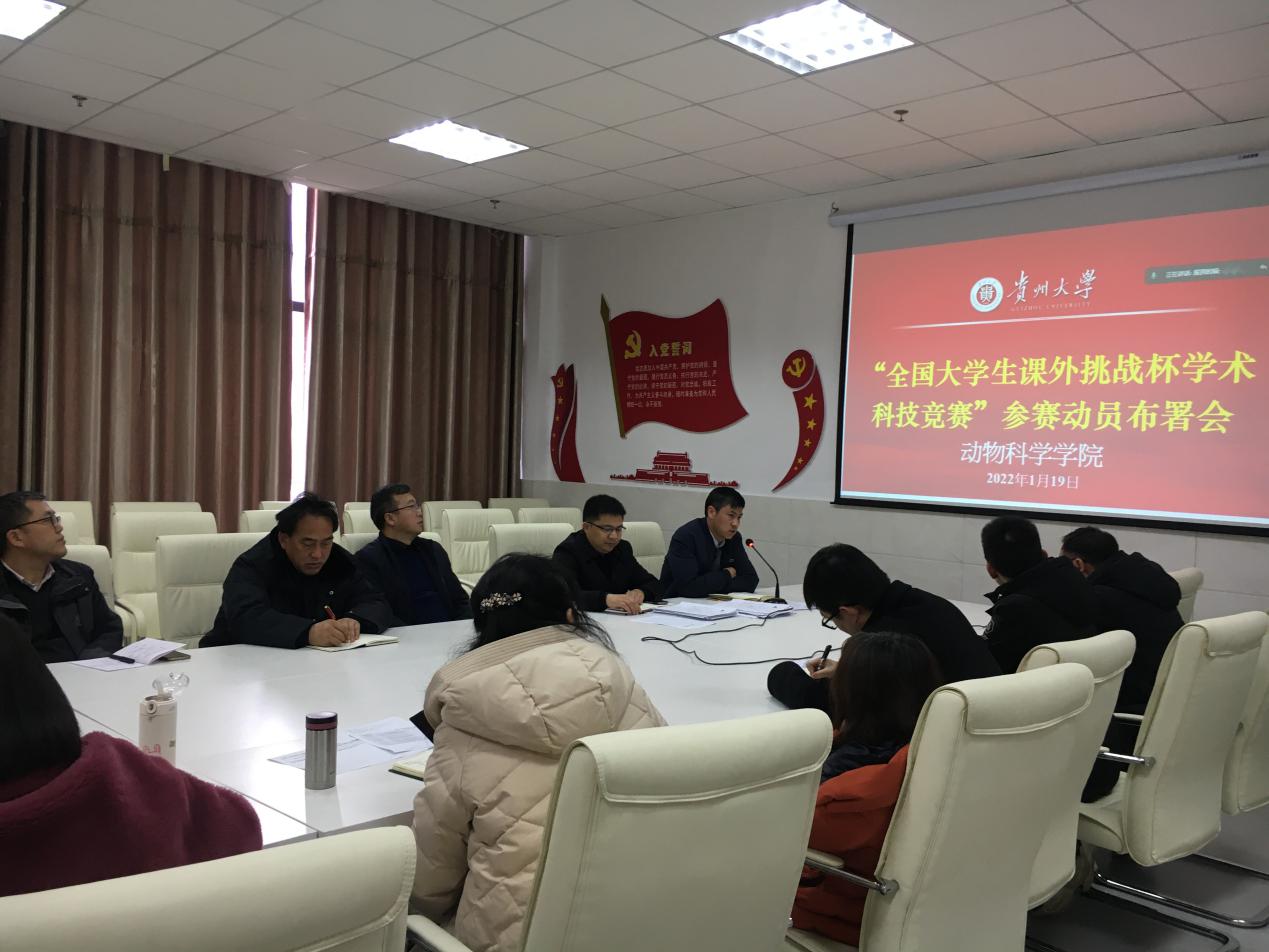 为响应国家大力实施"科教兴国"战略政策,努力培养广大青年的创新、创业意识,造就一代符合未来挑战要求的高素质人才。2022年1月19日上午,动物科学学院在崇学楼206会议室召开了“全国大学生课外挑战杯学术科技竞赛”参赛动员布署会,学院领导高度重视,会议由院长陈超教授亲自主持,会议采用线上、线下相结合的方式,学院领导及教师80余人参会。
