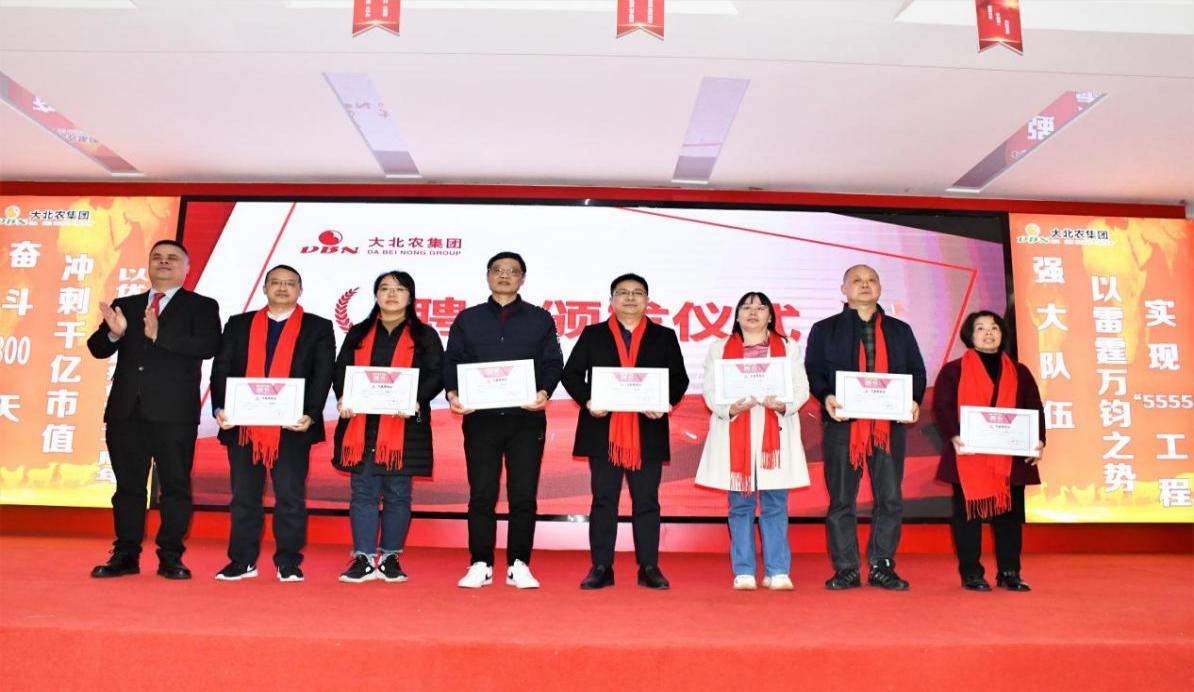 随后,大北农集团总裁助理张立彬博士宣读专家委员会名单。陈超担任专家委员会主任,燕志宏担任专家委员会副主任,徐娥、温贵兰、王开功、施晓丽、曾智勇担任专家委员会成员。大北农集团贵州分公司负责人张杰阳总裁为专家委员会成员颁发聘书。