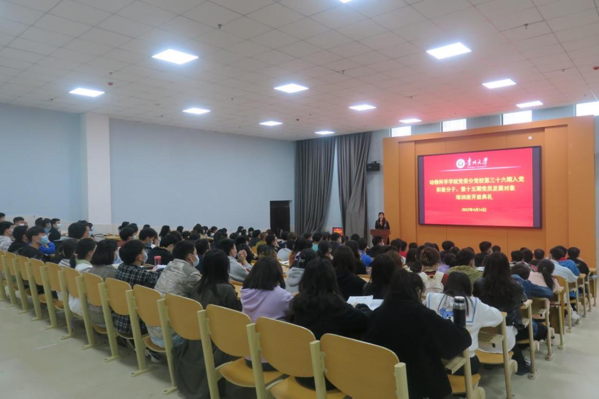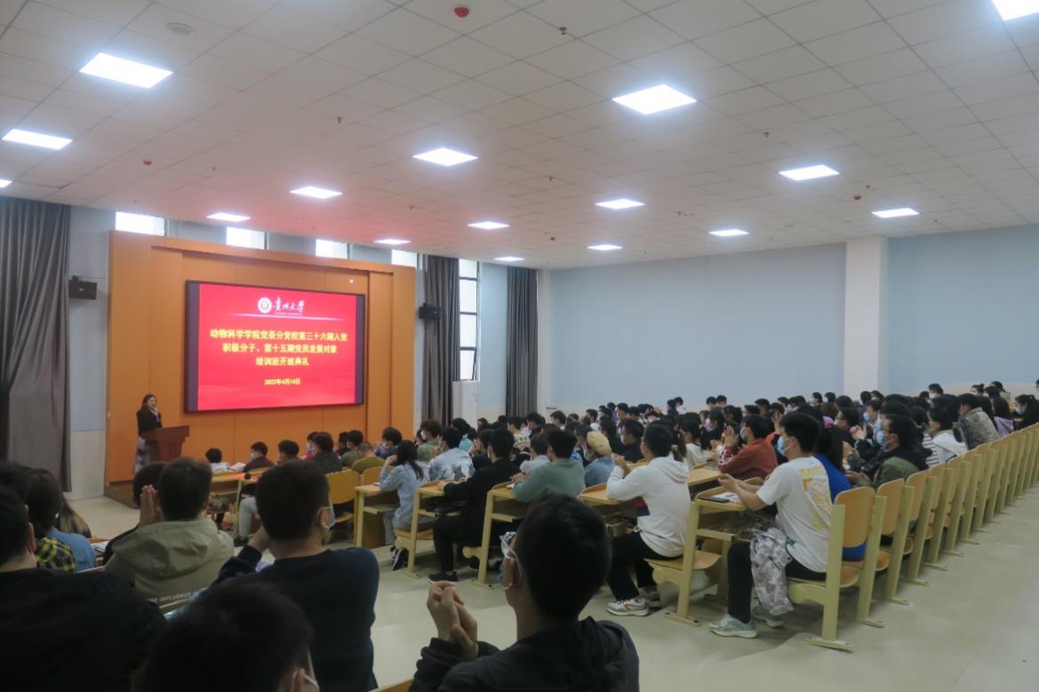 4月14日中午,动物科学学院党委分党校第三十六期入党积极分子、第十五期党员发展对象培训班开班典礼在崇学楼131举行。学院党委书记罗聃宁、各学生党支部书记、班主任及培训班学员180余人参加典礼。典礼由学生党支部书记聂江昱菡主持。