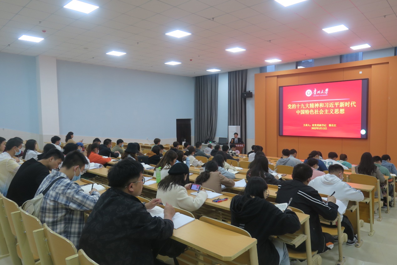 骆长江结合国内国际时事和自己的学习工作经历,深入细致地讲授了党的十九大召开的时间、背景、主要内容、重要意义等,并系统地讲解了习近平新时代中国特色社会主义思想的历史地位、丰富内涵及核心内容。他强调,党的十九大精神和习近平新时代中国特色社会主义思想博大精深,同学们要继续学深悟透、融会贯通、深刻理解党的十九大精神和习近平新时代中国特色社会主义思想的丰富内涵,践行全心全意为人民服务的根本宗旨,切实把思想和行动统一到习近平新时代中国特色社会主义思想上来,为实现中华民族伟大复兴的中国梦不懈奋斗。