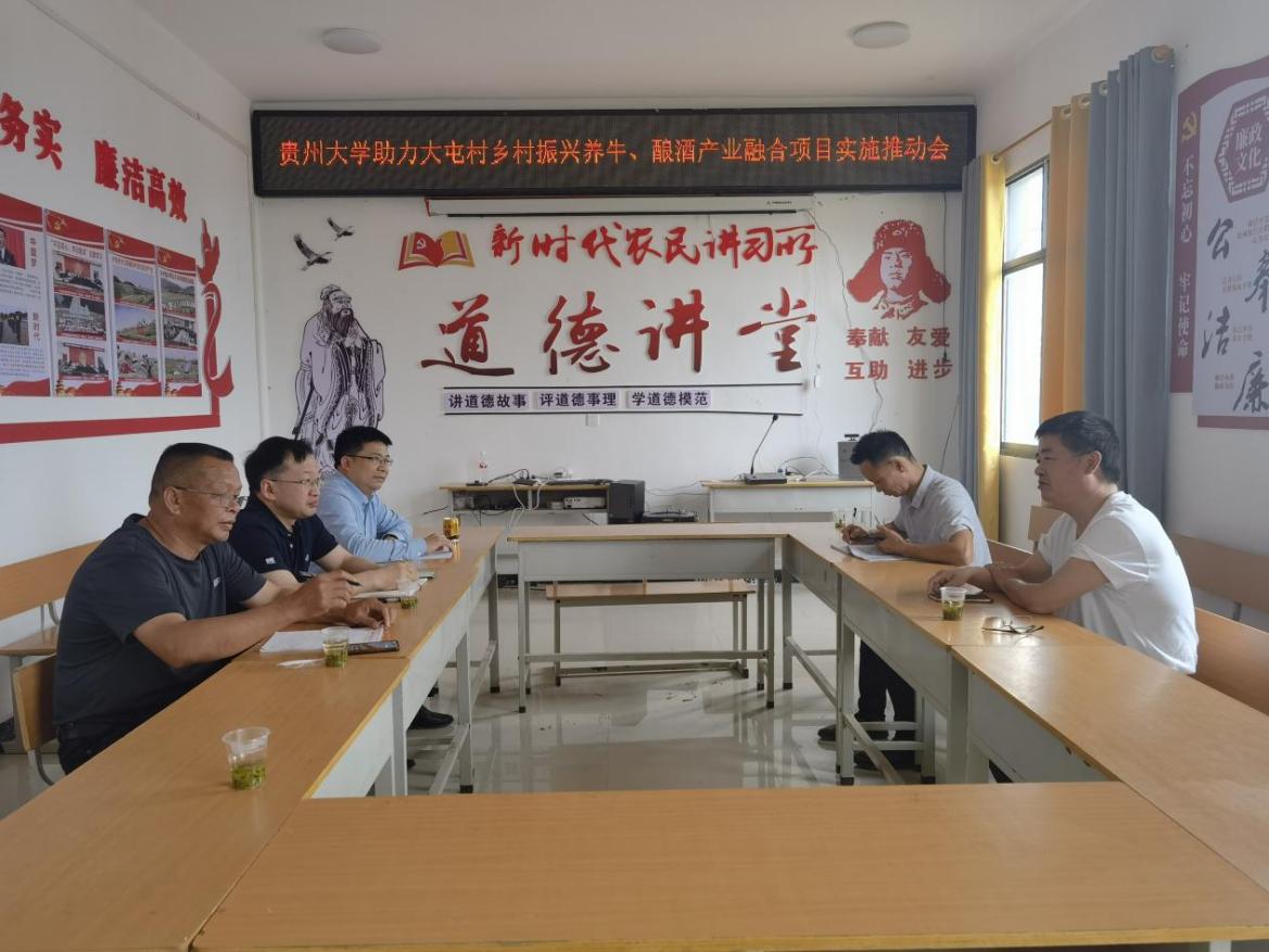 实地考察结束后,陈超、黄永光一行在大屯村村委会进行养牛、酿酒产业融合项目实施推动会,对拟引进湖南一茶企业落户大屯村进行商讨。