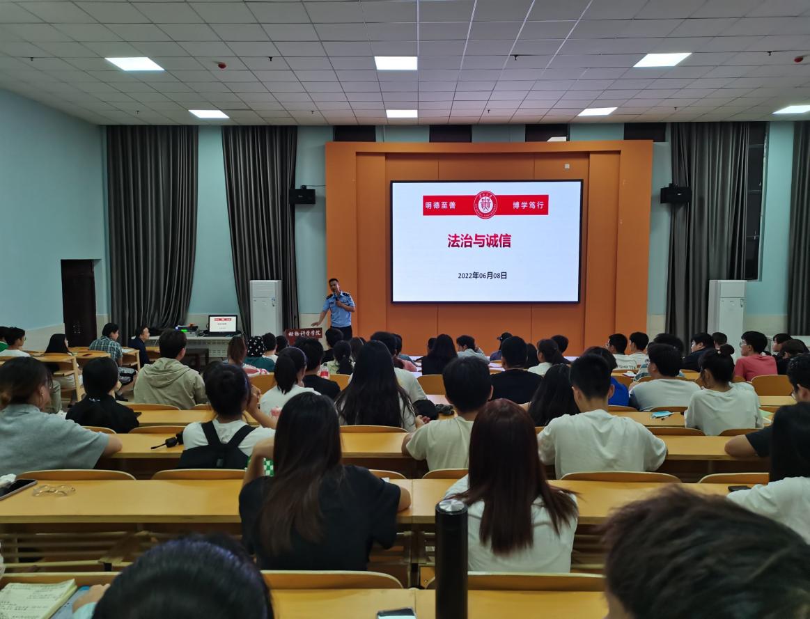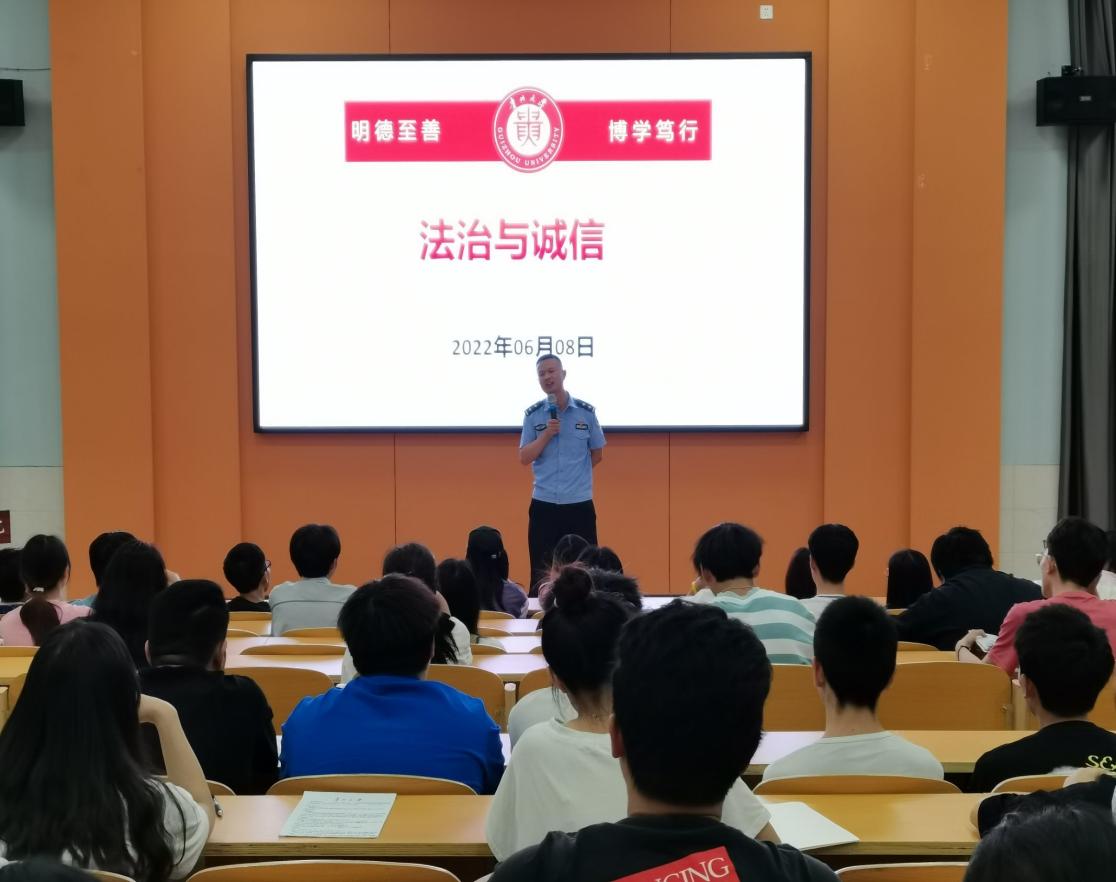 为了切实提升我院学生诚信意识与法律意识,6月8日晚,学院于崇学楼131报告厅举办了“法治与诚信”主题教育讲座,特邀花溪区公安局松山派出所赵普林警官来主讲,全院共200余名学生参加,学院本科生辅导员聂江昱菡、盛律平组织本次讲座,讲座由盛律平主持。