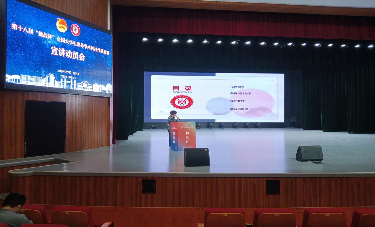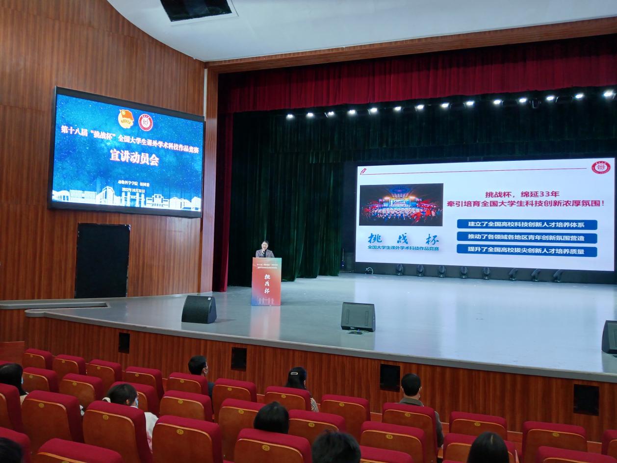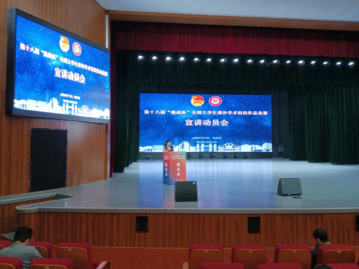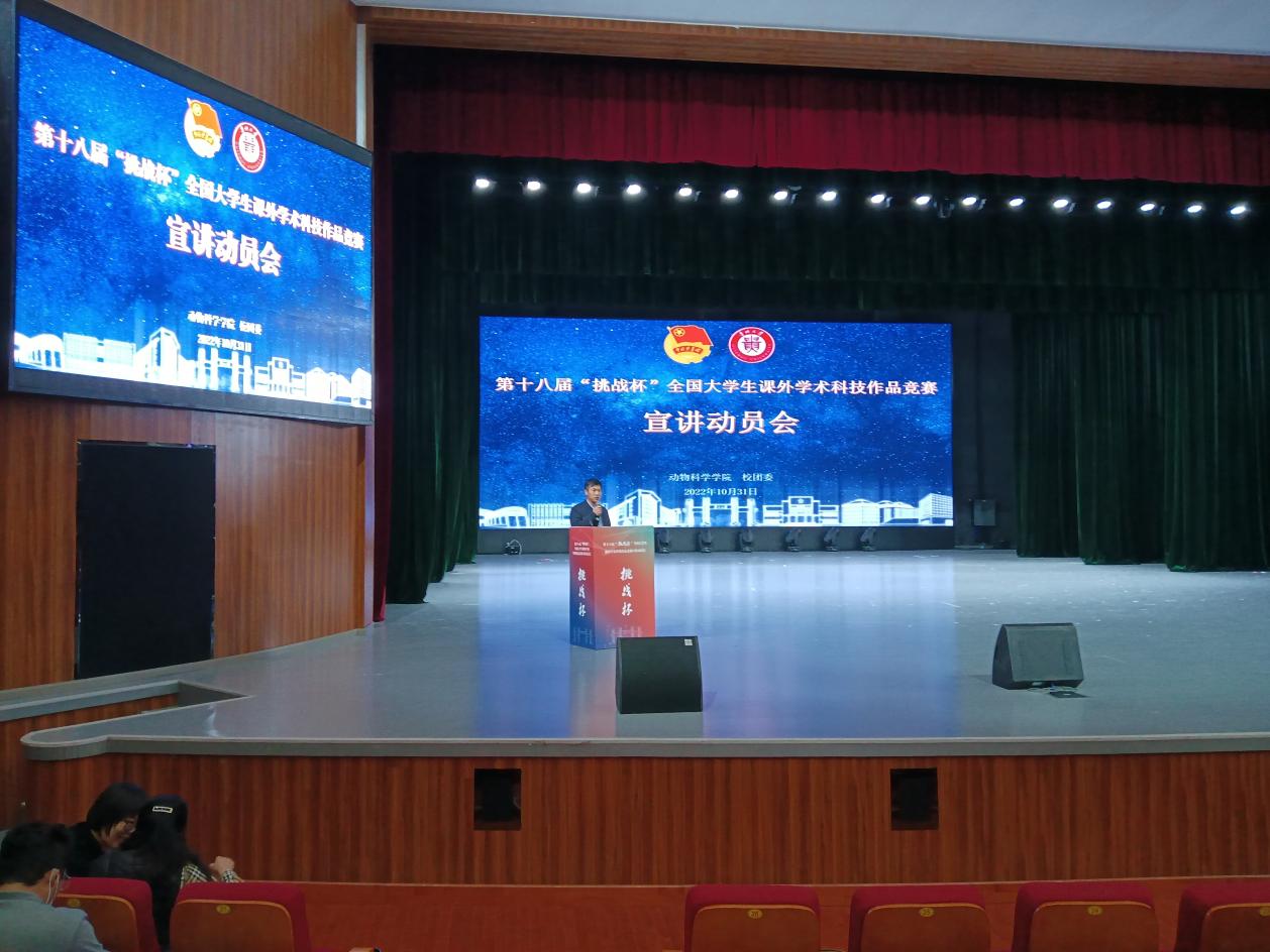秋风送爽,硕果飘香。10月31日晚,动物科学学院在溪山剧场召开了第十八届“挑战杯”全国大学生课外学术科技作品竞赛宣讲动员会。校团委书记刘魁、副书记杨晓椿出席,动科院党委书记罗聃宁、副书记杨乐、副院长陈祥参加,动科院全体研究生导师及学生共600余人到场,会议由杨乐主持。