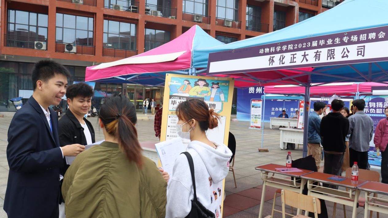 次日,招聘会在学院广场举办。动物科学学院党委书记罗聃宁、副书记杨乐带领学生科、研究生科辅导员到招聘会现场,为用人单位介绍了学院毕业生生源情况、专业情况,进行了岗位需求等方面的沟通。求职毕业生热情高涨,积极寻找与自身条件契合的职位,纷纷向意向单位递上自己精心准备的个人简历,仔细询问岗位信息,与用人单位进行充分交流、双向选择。