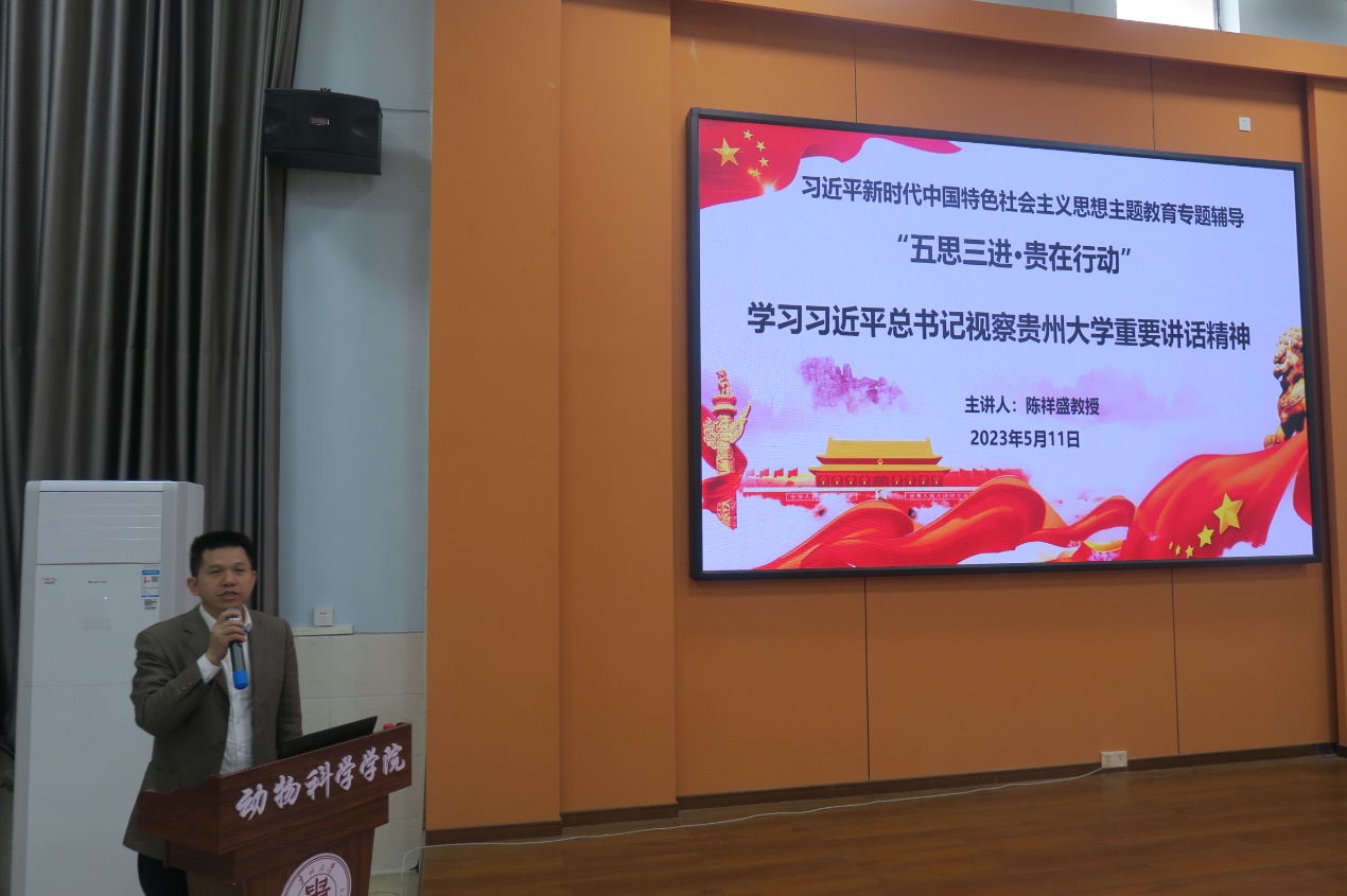 5月11日中午,副校长陈祥盛在崇学楼131报告厅为动物科学学院党员干部及入党积极分子讲授题为“‘五思三进·贵在行动’学习习近平总书记视察贵州大学重要讲话精神”党课。学院党员干部及入党积极分子70余人参加。