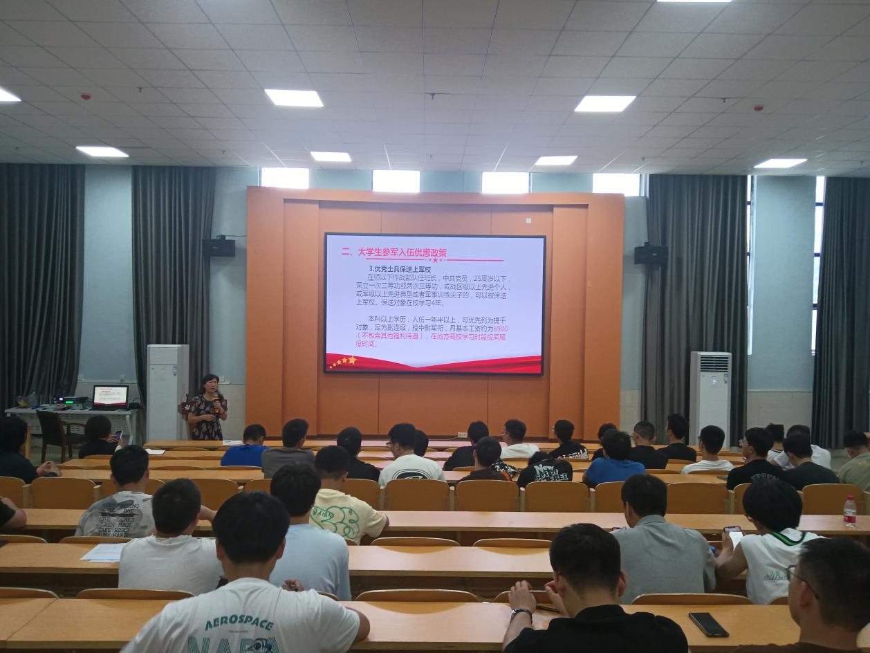 苟敏强调了大学生入伍对提升国家兵员质量和部队战斗力水平的重要性,她从大学生入伍优先征集、家庭优待、国家学费资助、入伍后的选用培养、复学升学、创业就业等方面介绍了大学生入伍的优抚优待政策,对学生如何改善身体素质和进行政治审查等方面给出指导建议,鼓励学生抓住机会投身军营,不负韶华报效人民。