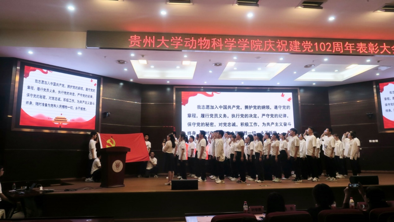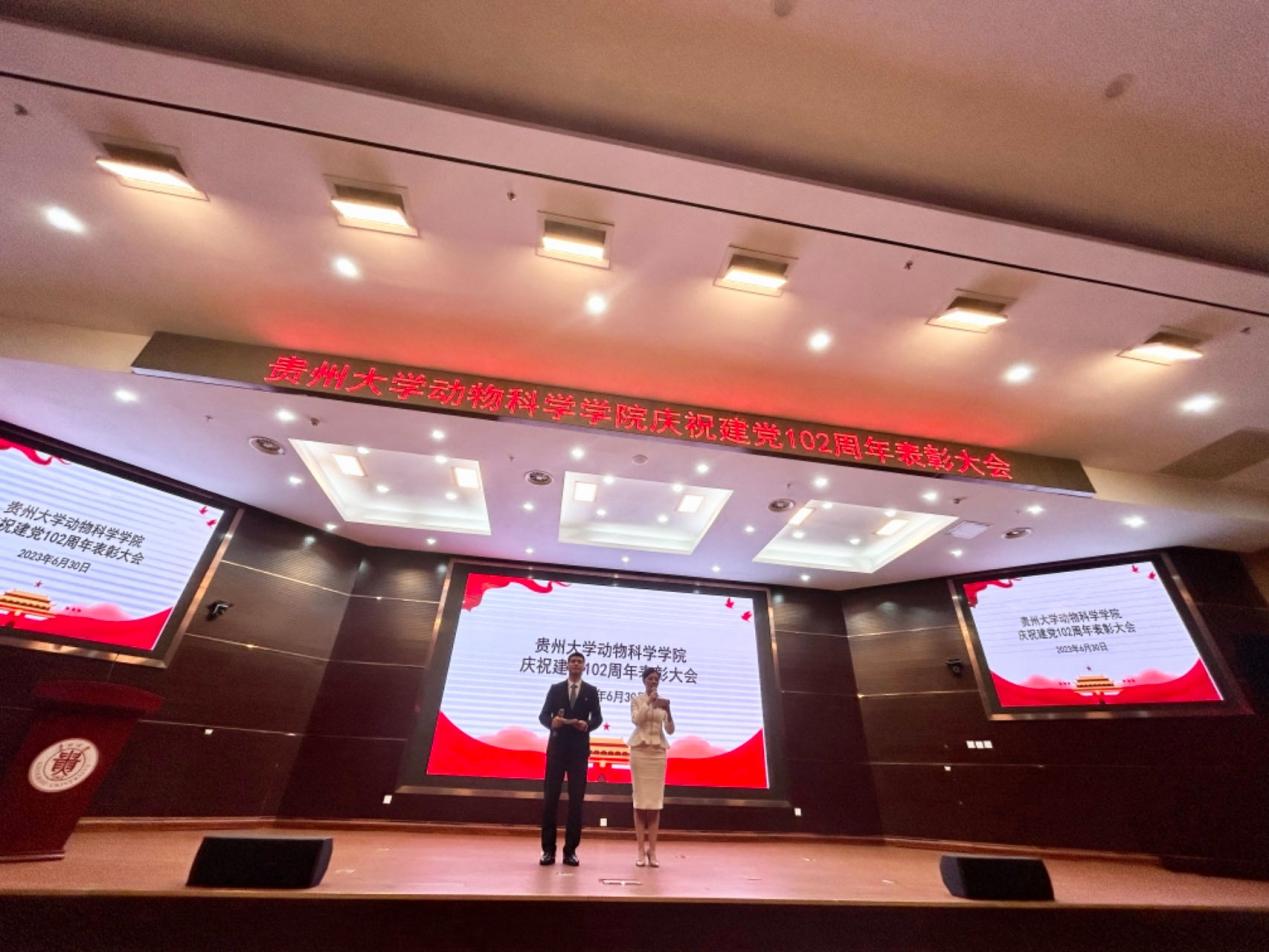 为隆重庆祝中国共产党成立102周年,6月30日晚上,动物科学学院在贤正楼107报告厅召开庆祝建党102周年表彰大会。贵州大学党委常委、副校长陈祥盛教授,学院党委书记罗聃宁,党委副书记、院长陈超,党委副书记杨乐,副院长欧德渊、陈祥,瑞辰宠物医院集团贵州第一分公司人事经理叶华燕出席会议,学院全体教职工、学生党员及学生代表200余人参加会议。大会由学生那彬彬、冯秩主持。