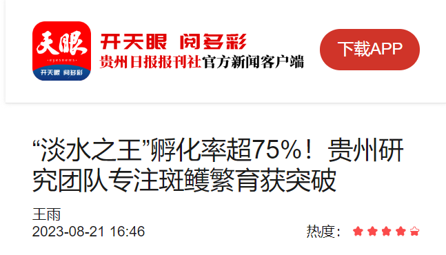 8月21日,记者从贵州大学获悉,由万象城平台、罗甸县养殖业发展中心、贵阳市水产站和贵州省罗甸县名贵鱼类生态养殖有限公司组成的研究团队,依托省科技厅《贵州土著名特鱼类-斑鱯(hù)人工繁殖技术研究》项目,开展斑鳠人工繁殖研究工作取得了新进展,斑鳠繁殖受精率从去年的30%提高到60%,孵化率达到75%以上,单次出苗5000多尾,再创佳绩。
