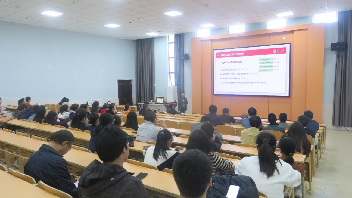为巩固学习成效,帮助全院教职工了解学校及学院高质量发展的重要任务,学院邀请校机关党委书记罗卫刚为全院师生做《综合考核工作政策要求及指标体系介绍》的报告。罗卫刚从接受上级部门综合考核总体情况、校内综合考核总体安排、校内考核指标制定说明等三个方面系统阐释了综合考核体系构成、高质量发展绩效考核、党建工作成效考核等指标体系。引导教师自觉增强责任感,把自身成长融入学校的高质量发展大局中,为贵州大学高质量发展贡献动科力量。