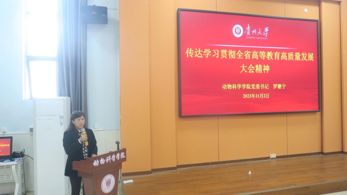 11月2日,动物科学学院召开全院教职工大会,传达学习全省高等教育高质量发展大会精神及学校高质量考核等相关工作要求,全院教职工100余人参加学习,会议由院党委书记罗聃宁主持。
