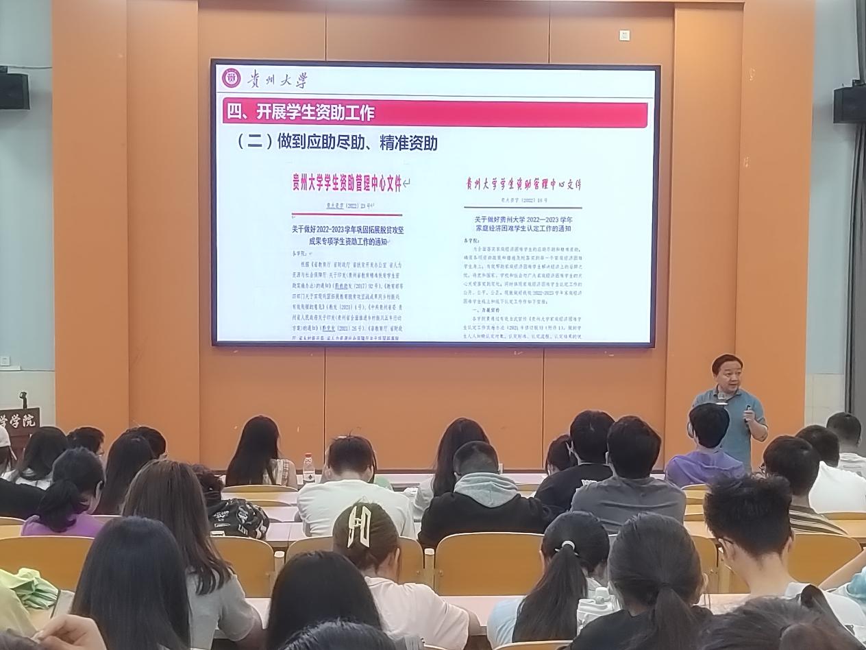 最后,盛律平进行了学生资助政策宣讲,介绍了学校开展学生资助政策的意义、目前学校学生资助政策的主要内容及学生受助的整体情况,要求大家把所获资助资金真正用在学习和生活上,同时努力学习,用优秀的成绩和表现来报效党和国家的关心关怀。
