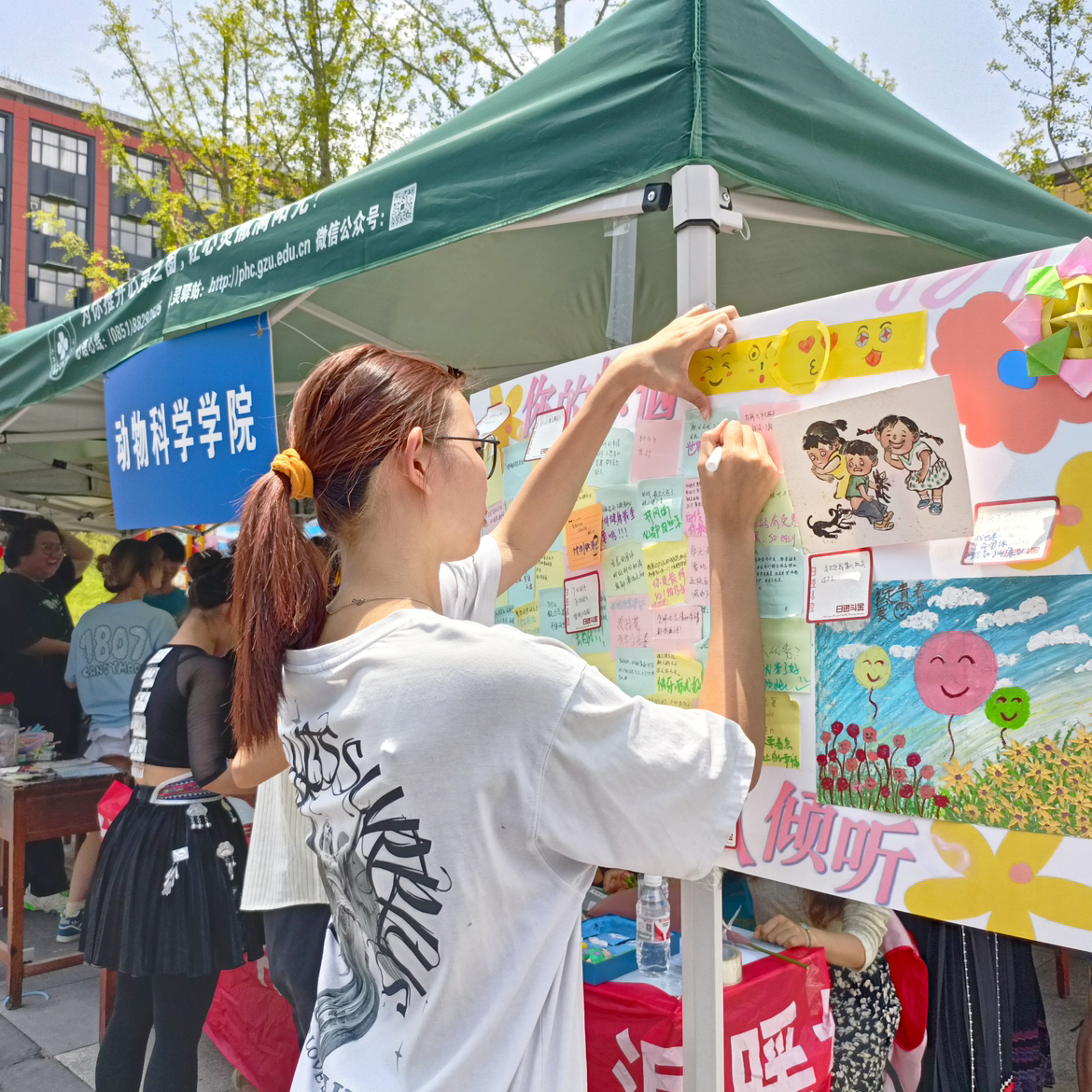 本次活动是学院心理健康系列活动中的又一项活动。工作人员将前两次活动中收集到的烦恼便利贴与笑脸墙作品粘贴上墙,并提前准备了各种精美小礼品。参与活动的同学通过回复展示板上的烦恼便利贴参与活动,倾听来自陌生朋友的烦恼,用自己的力量鼓励陌生的他(她)!