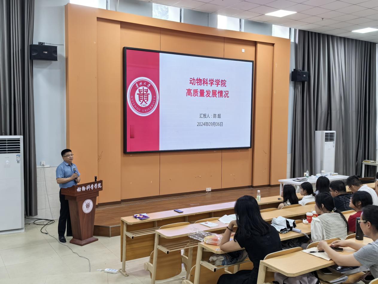 陈超以“动物科学学院高质量发展情况”为题为新生讲授开学第一课。他以学院基本情况、师资力量、教学成果为切入点介绍了学院的发展历程。陈超表示,学院一直以来注重创新创业平台建设,致力于打造国际化教学和多学科交叉融合,以此促进同学们健康成长。他鼓励同学们秉承校训,坚定理想、发愤图强,把个人成长与国家发展相结合,不负青春、不负时代。