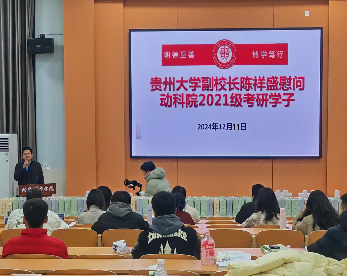 温情化寒霜,暖意润心田。考研进入了冲刺阶段,为在关键时候给予考研学子支持和鼓励,12月11日,贵州大学副校长陈祥盛教授莅临动科院博学教室,为考研学生送来温暖和关爱。