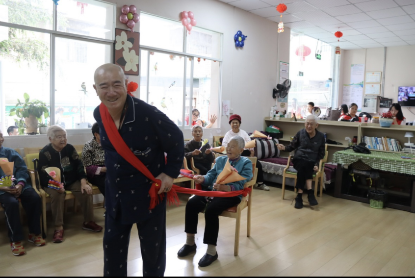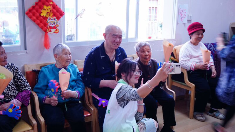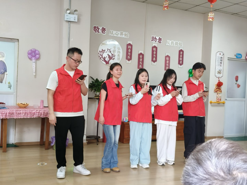 歌声舞影映孝心,诗韵和声暖暮年。活动伊始,同学们依次带来精彩节目,以歌声与表演传递对老人的关爱。率先登场的是学生第二党支部带来的合唱《桃花朵朵开》,悠扬的旋律在养老院大厅回荡,仿佛将春日的生机与活力带到老人们身边。随后,其他志愿者们深情朗诵冰心的《纸船—寄母亲》以及演唱《生命的旋律》,富有感染力的声音,饱含着对亲情的珍视与对生命的感悟。紧接着,充满温情的《感恩的心》手势舞表演,用无声却有力的肢体语言,表达对老人们的感恩与关怀。欢声笑语在空气中流淌,两位银发老人携手带来了一场别出心裁的“表演”。老爷爷握着红绳,牵引着坐在轮椅上的老奶奶,他们用满是岁月痕迹的双手,演绎着生活的趣味。幽默的动作惹得满堂欢笑,温馨的场景如同一幅暖色调的画卷,深深印刻在每个人的心中,令人久久难忘。