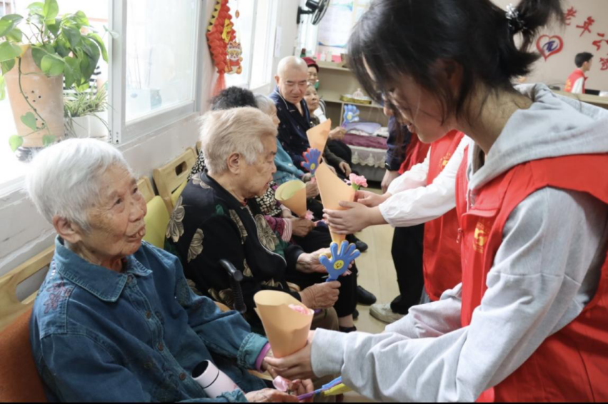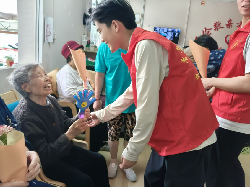 朵朵鲜花映初心,声声问候暖暮年。同学们手捧鲜艳的花朵,走到老人身边,将花束轻轻递到老人手中,并送上亲切的问候与祝福。一朵朵鲜花,承载着党员和志愿者们浓浓的敬老情意,老人们脸上绽放出幸福的笑容,现场温情满满,进一步拉近了同学们与老人之间的距离。
