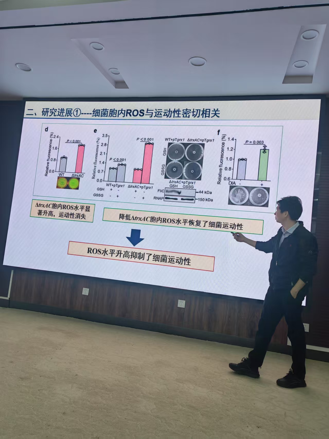 胡永华的报告题目为《水产动物致病菌毒力因子及其与宿主互作机制研究》,围绕研究团队简介、鱼类免疫与疫病预防、水产动物致病菌毒力因子及其与宿主互作机制等最新研究进展进行了讲解。重点介绍了杀鱼爱德华氏菌新型毒力因子的鉴定以及新型毒力因子与宿主互作的分子机制,随后就细菌胞内ROS产生与运动性、巨噬细胞氧化杀伤等之间的关系等问题与参会师生进行了互动交流。