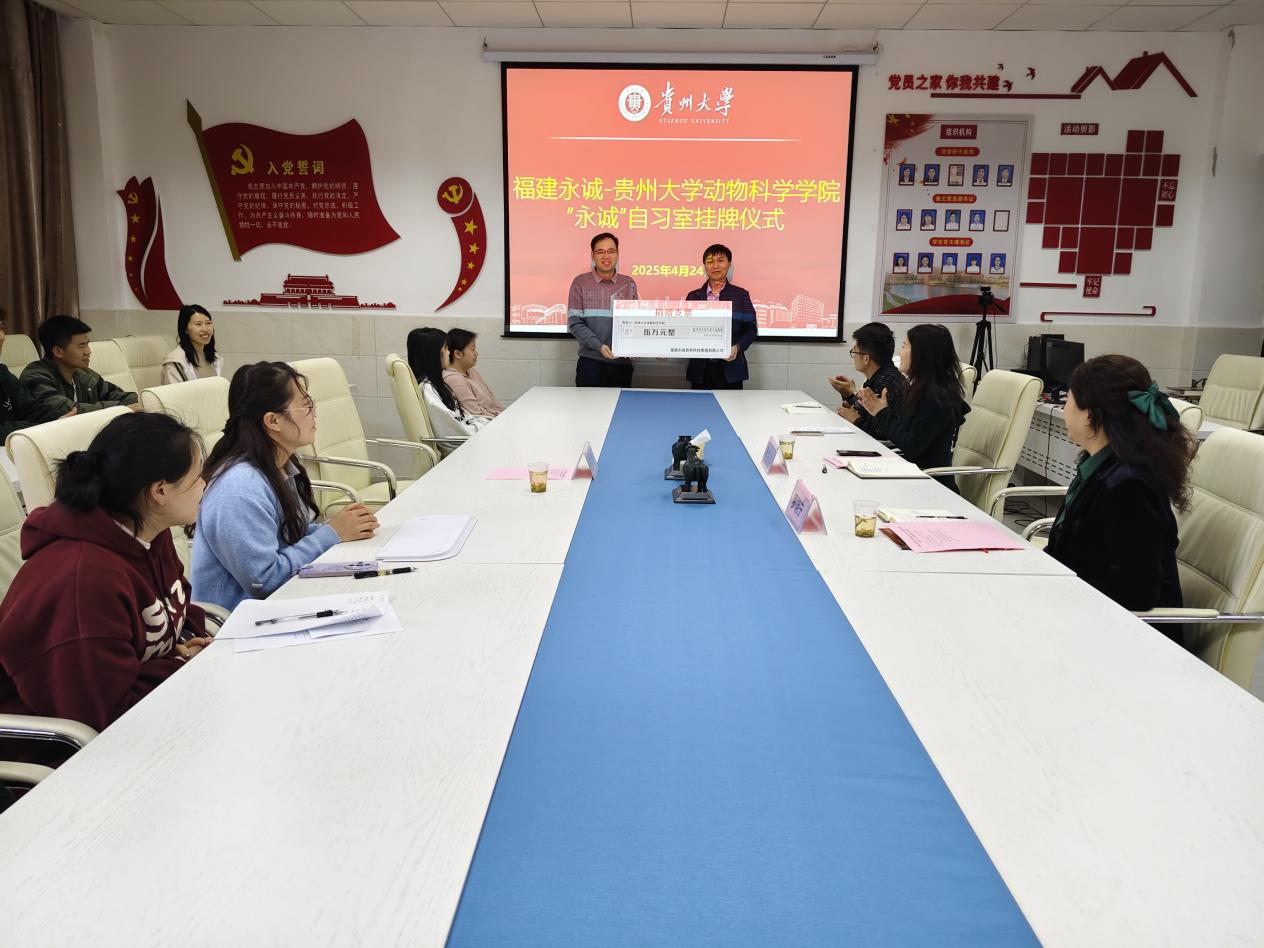4月24日下午,由福建永诚育种科技集团有限公司捐资设立的 “永诚” 自习室在万象城平台正式挂牌。集团人力资源部经理陈小明、学院党委书记罗聃宁、兽医点学科负责人程振涛教授及师生代表共同见证这一重要时刻。