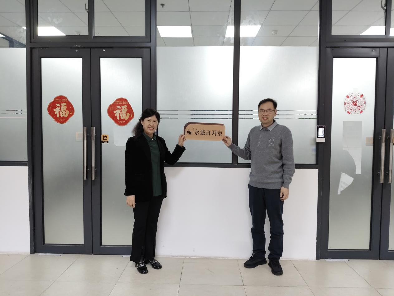 随后,全体与会人员来到自习室,陈小明与罗聃宁共同为 “永诚” 自习室揭牌。据悉,该自习室位于学院一楼玻璃房区域,可同时容纳近80名学生,改善了我院研究生自习室紧缺的问题。