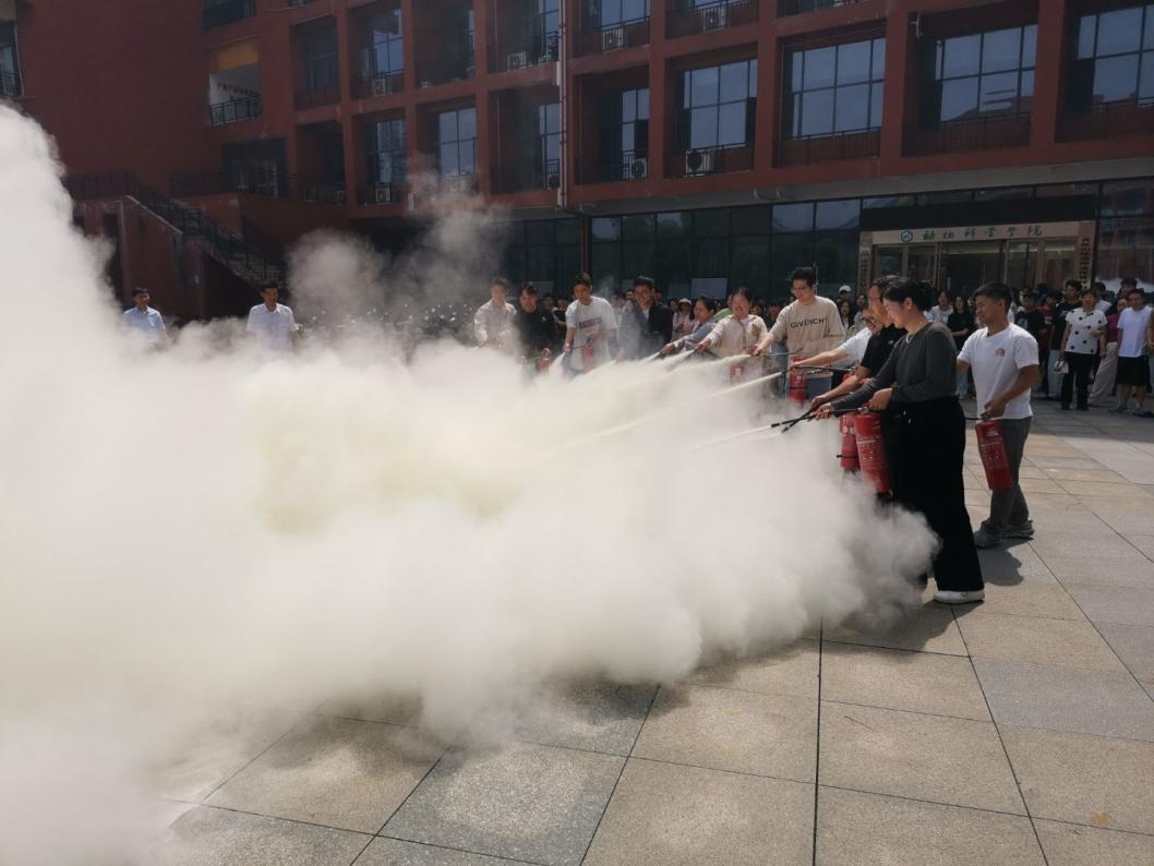 演练包含应急疏散演练及扑灭模拟火源两个模块。在模拟烟雾环境中,谷声兵组织师生进行应急疏散演练,指导大家实践弯腰低姿、湿布捂鼻、快速有序撤离的动作要领。在谷声兵的指导下,师生代表分组使用干粉灭火器对模拟火源(油盆火)进行扑灭操作,掌握 “提、拔、握、压” 四字诀窍。