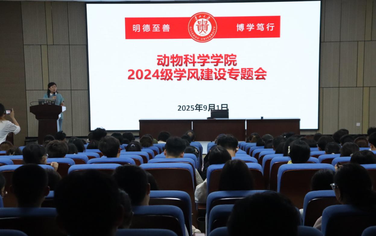 9 月 1 日中午,动物科学学院在崇德楼124 报告厅举办 2024 级本科生学风建设专题会暨书记院长面对面。学院党委书记罗聃宁、副院长欧德渊及程振涛出席会议,学生科辅导员、2024 级本科生班主任带领全体学生参会,学生科科长聂江昱菡主持会议。